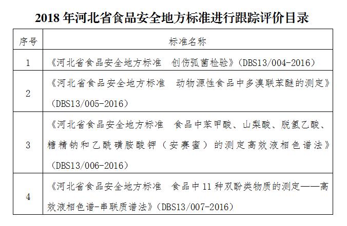 2018年,重点对2016年发布的4个河北省食品安全地方标准进行跟踪评价(见附件)。参照《食品安全国家标准跟踪评价规范(试行)》,采用培训、问卷调查、专家咨询等方式,广泛收集标准实施中的问题和建议。