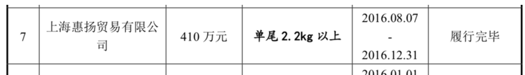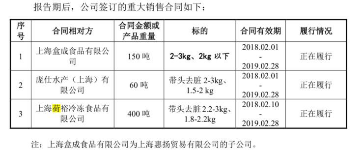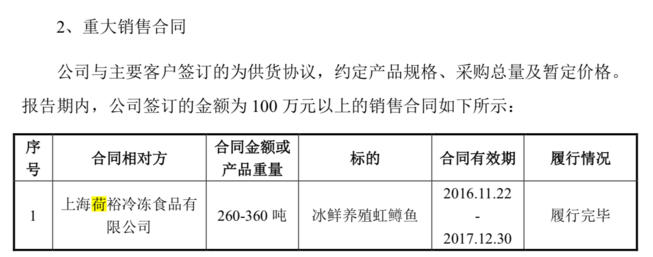 在《说明书》的“重大销售合同”列表里,惠扬贸易在2016年8月7日至2016年12月31日的有效合同期内向文祥渔业采购了410万元2.2千克以上的冰鲜养殖虹鳟鱼。这一合同已被履行完毕。