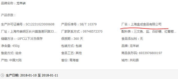 号称产出中国“三分之一的三文鱼”、实际生产虹鳟鱼的民泽公司,其一部分虹鳟流入了下游加工企业盒成。盒成不仅从文祥渔业采购原料,还和民泽公司有合作关系。龙羊峡旗舰店是民泽公司在天猫上的销售平台。在天猫龙羊峡旗舰店内,除鱼松以外的所有虹鳟产品,加工厂都为上海盒成食品有限公司。