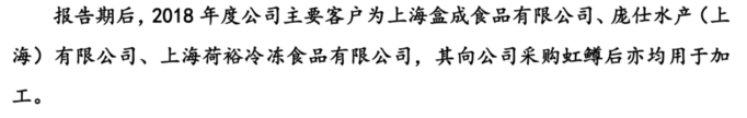 澎湃新闻记者在全国股转系统指定信息披露平台上找到了文祥渔业在今年6月26日披露的《公开转让说明书》。这份别人家的《说明书》为荷裕采购虹鳟作为加工原料添上一记实锤。