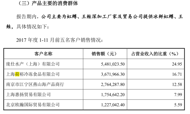 文祥渔业的《说明书》在第135页用加粗字体强调,“2018年度公司主要客户为上海盒成食品有限公司、庞仕水产(上海)有限公司、上海荷裕冷冻食品有限公司,其向公司采购虹鳟后亦均用于加工。”显然,荷裕是作为文祥渔业的重要虹鳟采购商被写入了别人家的公开说明中。