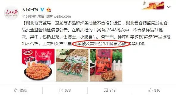 8月30日,湖北省食品药品监督管理局发布了食品安全监督抽检信息公告,在抽检出的不合格食品中,包括“卫龙”品牌的亲嘴烧和小面筋。其不合格原因是被检查出“违规添加山梨酸、脱氢乙酸同等添加剂”;山梨酸及其钾盐(以山梨酸计)检出值0.163g/Kg,其标准要求“不得使用”,脱氢乙酸及其钠盐(以脱氢乙酸计)检出值为0.131g/Kg,其标准要求也是“不得使用”。