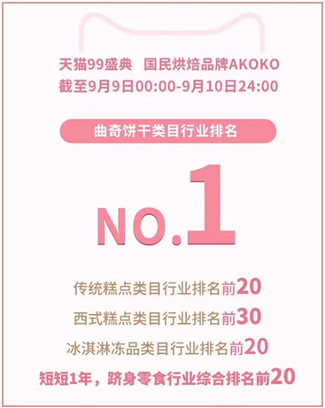 9月10日24:00,一年一度的天猫聚划算99欢聚盛典的“超划算尖货”购物狂欢趴拉下帷幕。在这场被视为“双11”前重要“模考”的天猫年度大型营销盛宴中,国民烘焙品牌AKOKO凭借超强的产品力、超好的品牌口碑、超多的粉丝群体,在中外众多大牌的激烈竞争中,再次稳稳地雄踞“曲奇饼干类目行业第一”的宝座,同时,冰淇淋冻品类目、传统糕点类目等也挺进了行业20强。从全网爆红的曲奇销售冠军,到现在多品类产品的美味旋风席卷,短短1年不到,AKOKO成功跻身零食行业综合排名前20名,成为休闲零食赛道快速升起的闪亮新星,更成为国民心中美味零食的首选、美好生活的标配。