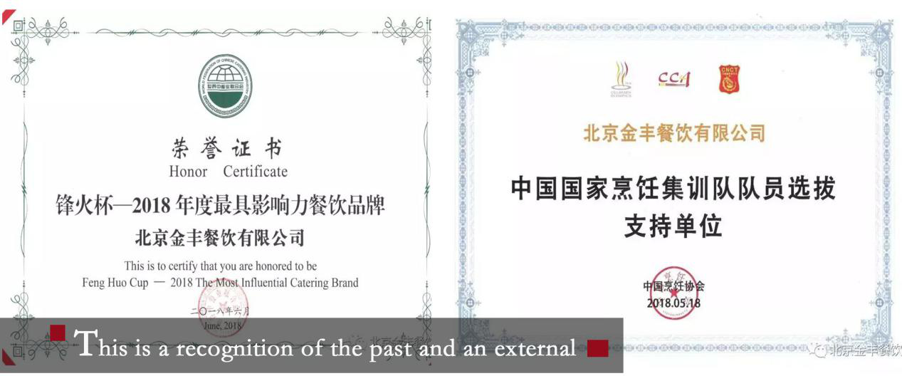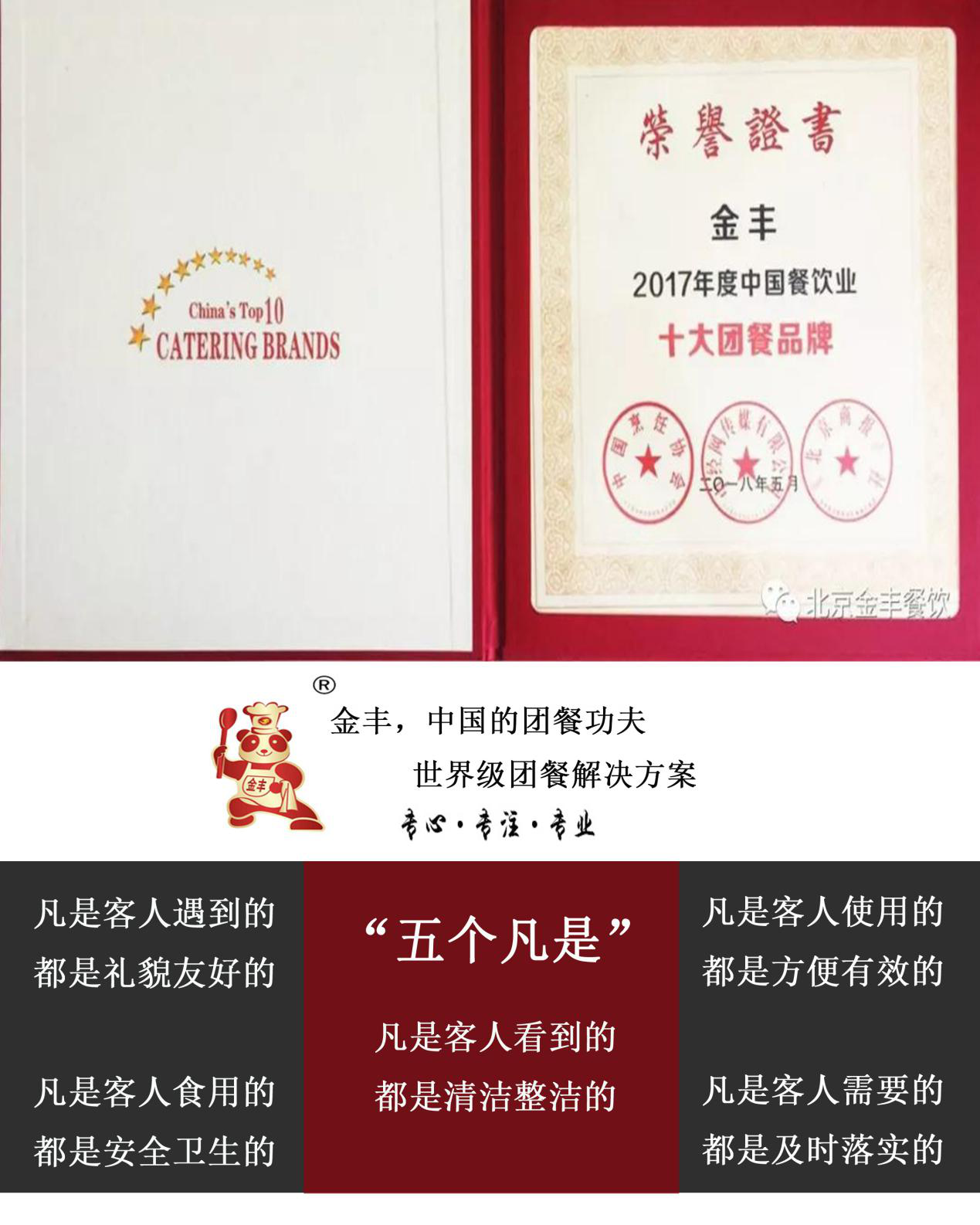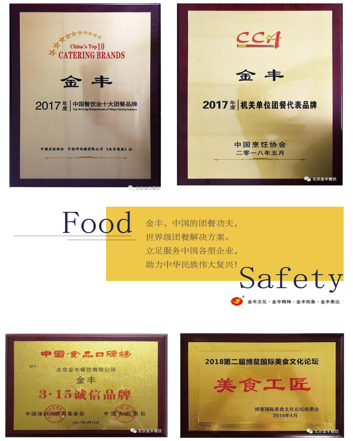 仅仅十四年,金丰获得的荣誉数不胜数。自2012起,金丰连续七年被中国烹饪协会、世界中餐业联合会、中国饭店协会、北京烹饪协会评为中国团餐十大品牌、中国团餐十佳品牌、中国团餐领军品牌、中国团餐百强企业、最具影响力餐饮品牌、餐饮创新品牌企业、北京餐饮十大品牌、纳税十佳企业等荣誉称号;并连续七年获得“机关单位团餐代表品牌” 、“工商企业团餐代表品牌”、“社区、医疗、养老团餐代表品牌”、 “高校团餐代表品牌”、“中小学团餐代表品牌”、“交通团餐代表品牌”等细分团餐领域荣誉称号;以及科技部“十二五”农村产业化科研带头单位等荣誉称号。金丰集团董事长宋子刚先生也因其在餐饮行业的卓越贡献,获得了“改革开放40年中国餐饮业·企业家突出贡献人物”、“北京餐饮十大企业家” “中国烹饪协会特邀副会长单位代表人”等荣誉称号。