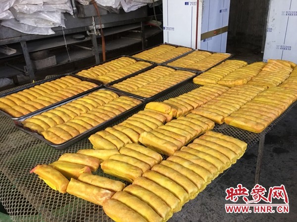 制成的薄饼被里间的工作人员拿过去,卷起红色的肉状物后,再送至蒸箱内烤,烤出的成品,制成蛋卷肠。