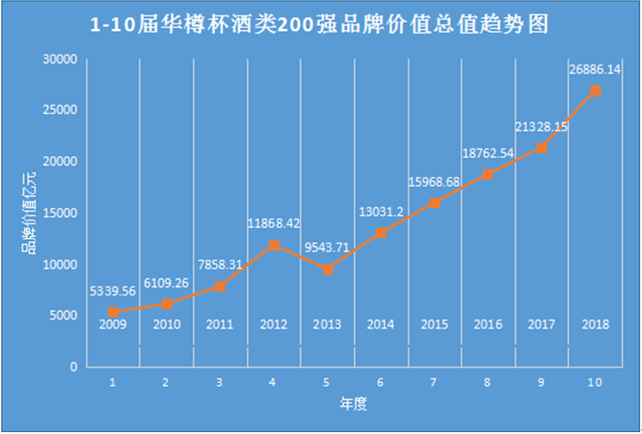 10年来,200强入围企业的品牌价值总和从首届(2009年)的5339.56亿元上涨到第10届(2018年)的26886.14亿元,增长率高达403.53%。