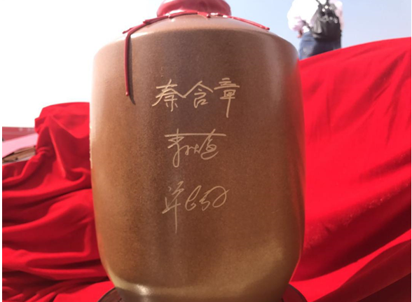 2017年9月,一坛同样封藏30年的10L装头锅原浆汾酒,被新华都董事长金志国以320万元的天价竞得,相比第一届的竞买价格整整高了91万。这坛酒的特别之处在于,它是由110岁高龄的酒业泰斗秦含章老先生以及汾酒集团党委书记、董事长李秋喜,汾酒集团总经理、汾酒股份董事长谭忠豹共同签名的联名款。秦含章老先生,是中国酿酒事业的一代宗师,不仅是中国酿酒科学的“世纪匠人”,更是国宝级的“酒文化大使”。有三位酒界大咖的联名,这坛酒的收藏价值也自然非同寻常。