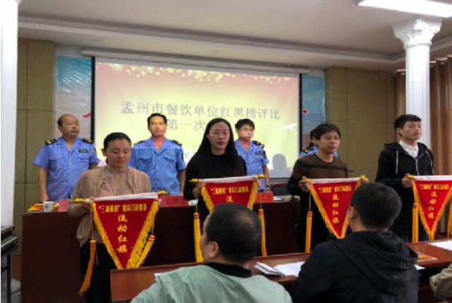 会议上宣读了《关于对全市餐饮单位建立“红黑榜”制度的通知》和第一期《孟州市餐饮业红黑榜名单》;对红榜和黑榜的餐饮单位分别授于红旗和蓝旗,红旗单位代表进行了经验交流,蓝旗单位代表做了表态发言。市食安办主任、市食药监管局局长李红卫对开展红黑榜评比的目的和意义、评比中发现存在的问题、红黑榜惩戒措施等问题提出要求,并对此次进入红榜领到红旗的先进餐饮单位进行了表扬,希望红旗单位戒骄戒躁,继续保持,争取次次拿红旗,蓝旗单位不要气馁,查找不足,认真整改,争取在下次的评比中进入先进单位。