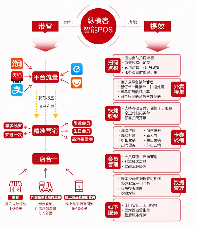纵横客智能POS以阿里五大平台亿级流量为入口,为商家引流锁客。具体而言,口碑的入口为堂食和预点餐带来线上订单;饿了么的入口为外卖增效、流量互导;淘宝口碑生活、天猫聚划算将为商家提供优惠套餐入口。通过全场景一体化互通,纵横客将为商家持续带客引流。
