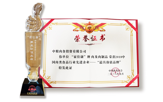 展会期间,中粮肉食被中国肉类协会授予“2018中国肉类食品行业先进企业——最具价值品牌”荣誉称号。