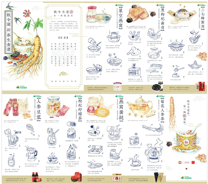 为了让年轻消费者形成持续滋补养生消费的习惯,阿里健康推出精美的国风创意插画食谱,将七道料理的详细做法图文并茂地展现给消费者,并给出聚划算滋补食材购买tips,实现 “一条龙”消费体验。另外由人气美食博主@仙气料理 拍摄的国风料理指南,绘声绘色地向消费者展示了这七道滋补料理的做法。