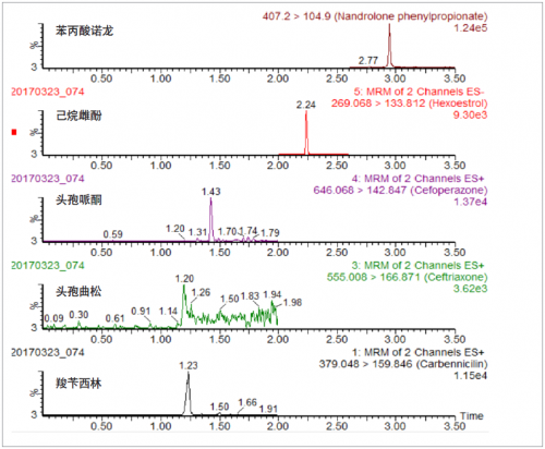本实验中使用UPLC/XEVO TQ-XS 建立了一种同时检测羧苄西林、头孢哌酮、头孢曲松、苯丙酸诺龙、己烷雌酚等5种化合物的定量分析方法;在兼顾这5种化合物不同化学性质的前提下,达到了较高的灵敏度,远低于目前行业标准对其残留限量的要求,数据稳定重现,为居民日益关注的食品安全问题加上了又一道安全防线。