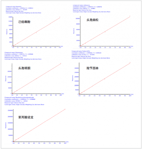 五种化合物在0.01-10ppb范围内,线性良好,线性相关系数R2皆大于0.99,详见下图。