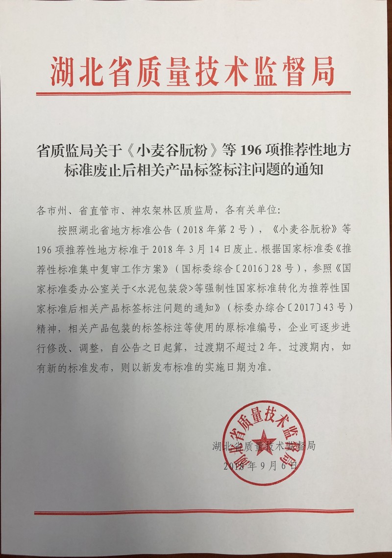 湖北省质监局关于《小麦谷朊粉》等196项推荐性地方标准废止后相关产品标签标注问题的通知