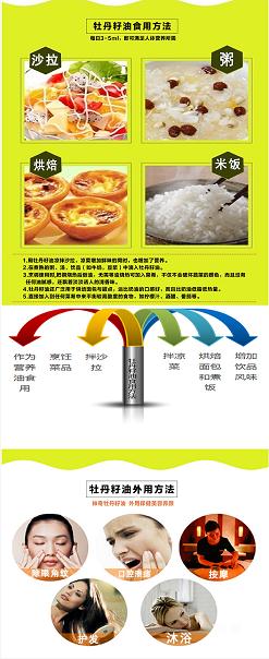 牡丹籽油还广泛用于烘培面包和甜点,远比奶油的口感好,而且比奶油低脂低热量。直接加入到任何菜肴中来平衡高酸度食物,如柠檬汁、酒醋、番茄等。除了烹饪食用外,牡丹籽油还具备外用功能,外用保健美容美颜,外用涂抹可以去眼角纹,口腔溃疡,沐浴、护发,按摩等等非常神奇。被誉为全球最好的食用油牡丹籽油,你值得拥有。