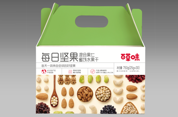 而每日坚果更是收获了上千万用户的追捧,曾经在20秒内卖出15万包,锁鲜装得创新包装让百草味每日坚果干湿分离并且获得专利。据悉,百草味每日坚果的产品小组团队花了三年打磨这款产品,先后走访了国外美洲大陆、东南亚多个国家,最后确定了每日坚果八种食材以及原产地。