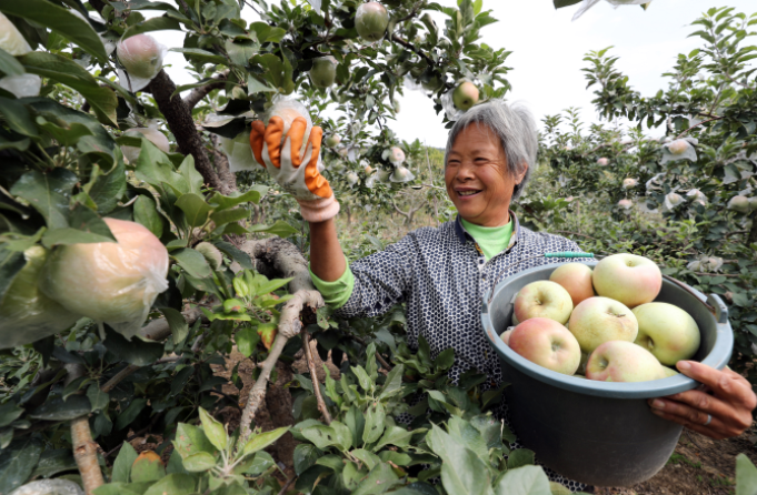 10月7日,江苏省连云港市赣榆区黑林镇吴山村村民在采摘苹果。