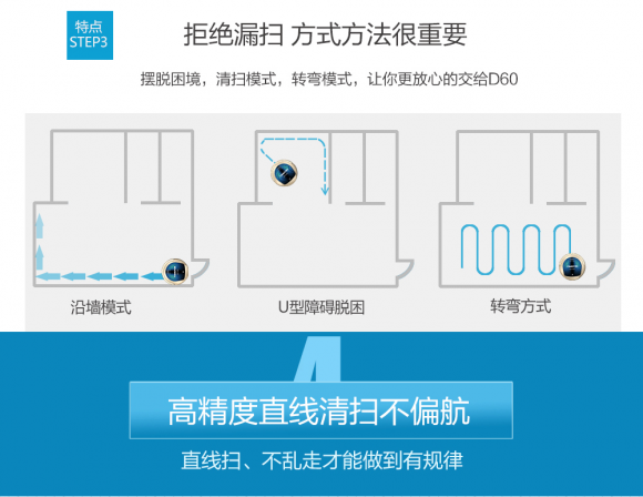 一代的扫地机器人只有眼睛,但斐纳TOMEFON TF-D60扫地机器人全面升级打造有眼睛、有大脑、有记忆的扫地机器人产品。这款产品最突出的特质是搭载可品牌专有的智能定位导航专用芯片,这种芯片内建多种感测及运动控制协处理器,能够实现室内精准定位和自主导航。通俗而言,就是你将这款扫地机器人放置在房间,它能自主的进行高精度定位导航,芯片自主储存房间的构造,同时自动的划分区域,如同妈妈般没有遗漏,消费者不再担心使用这款扫地机器人后还要进行二次清扫。