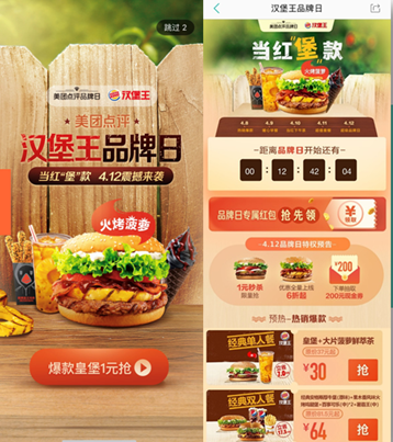 以汉堡王为例,2018年4月,汉堡王在美团和大众点评双平台推出“当红‘堡”款”为主题的超级品牌日活动。预热期间,通过超值团单、全场通用红包发放等形式强势调动C端用户热情,品牌日当天更是放出“1元秒杀”、“新品独家优惠”、“下单抽奖”等大招,掀起了一场平台、品牌、用户联动的狂欢派对。活动期间的品牌曝光量达到1.48亿次,“超级品牌日”当天的交易更是冲到峰值。