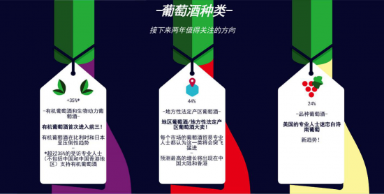 超过35%的受访者(不包括中国和中国香港地区)表示有机葡萄酒和生物动力葡萄酒在未来两年将超越品种葡萄酒,发展潜力最高。有机葡萄酒的流行在比利时已成为一种趋势,在日本也是如此。日本也對自然酒有著浓厚的兴趣。