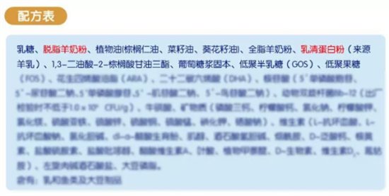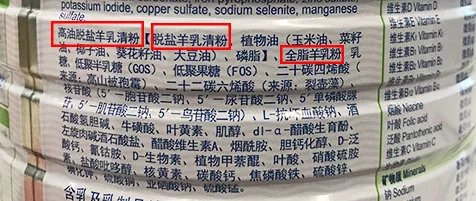 非全羊乳蛋白配方羊奶粉一般是在添加“浓缩乳清蛋白”“脱盐乳清粉”“羊乳清蛋白”的同时加入了牛乳蛋白。