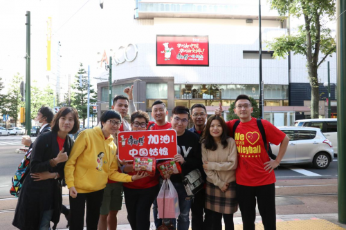 在聚会结束时,有球迷提议去康师傅的助威海报前去来张大合影,也算是给这次聚会来个记忆点。“加油中国,加油女排 耶!”在这响亮的助威声中聚会的欢乐在这一刻定格。