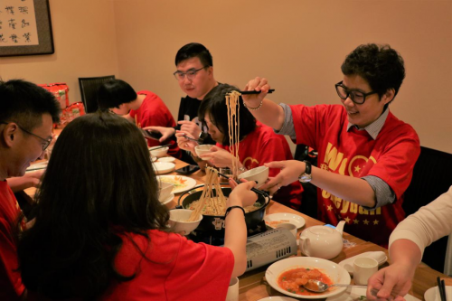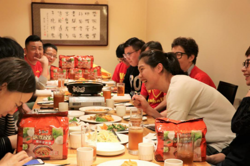 彭能亮来自新加坡、王鹏来自美国、刘璐来自青岛……天南海北的十多位球迷因中国女排而结缘聚到一起,大家共同的的话题始终离不开喜爱的中国女排,这次在海外的机缘不仅仅是相聚相识,还能一起在中国美食面前大快朵颐,支起了小火锅,再加上和郎导与婷队颇有渊源的康师傅锅煮拉面,百般滋味的酝酿伴随着咕嘟咕嘟四溢的香气开始了。