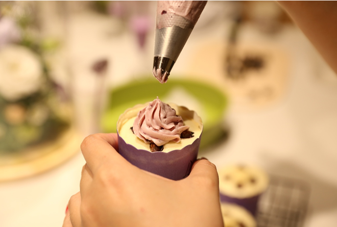 互动抢答与试饮环节结束后,活动进入当天重头戏---「蓝莓牛乳麦芬+紫薯奶昔」制作。第一道蓝莓牛乳麦芬甜点,大家在老师带领下分为三个步骤进行制作:麦芬蛋糕胚,蓝莓奶油及装饰。麦芬蛋糕胚:在中号打蛋盆放入无盐黄油,细砂糖后打发黄油颜色发白;随后分次加入奶油奶酪打发至羽毛状,打发好后再分次加入蛋液低速打发均匀,筛入面粉,泡打粉搅拌,再分次加畅销澳洲的a2™鲜牛奶搅拌均匀,随后便可将搅拌好的面糊倒入纸模内,装饰上蓝莓送入烤箱烘烤(180℃,22分钟)。其次,蓝莓奶油:在小号打蛋盆内发那个如奶油奶酪,打发至羽毛状后加入蓝莓酱拌匀,再将奶油装入裱花袋内放入冰箱冷藏备用。最后,装饰环节:将烤好的麦芬蛋糕散热后,在其表面裱上蓝莓奶油,再用蓝莓和银珠装饰。经过简单的几个步骤,酥软可口的蓝莓牛乳麦芬成功出炉,大家的兴致也瞬间达到最高点;随后大家带着首道甜点胜利的喜悦和热情,一步步将精选紫薯蒸熟去皮压泥,加入细砂糖搅拌均匀后放入搅拌机。在搅拌机中加入适量a2™鲜牛奶打成奶昔,营养满满的紫薯奶昔就完成了。