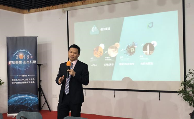 在主题演讲环节,中食链总经理范金刚首先为现场嘉宾分享了他在倡导构建信用社会的核心观点。他首先从信任的演进过程进行分析,他认为从古至今信任经历了从高潮到低谷的演变阶段,在当代社会,诚信体系建设已然成为一个非常重要的社会课题。区块链这一融汇了信息科学、密码学、数学、社会学和心理学等跨学科领域的集大成者,被誉为信任的机器。这项伟大技术,将有望带领我们重返信任高潮阶段。中食链正是以重塑食品产业信用体系为初心,以打造中国首个食品行业公链平台为抓手,推动中国食品产业的健康发展,倡导构建绿色有机生态环境,契合国家“精准扶贫”和“数字中国”政策,赋能实体经济发展。