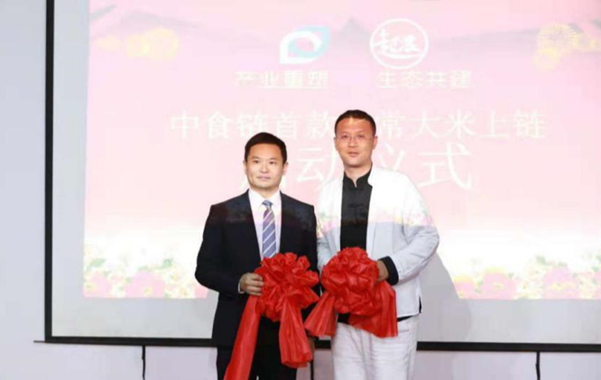 中食链总经理范金刚与起浪稻米创始人班大胜共同启动中食链首款五常大米上链仪式