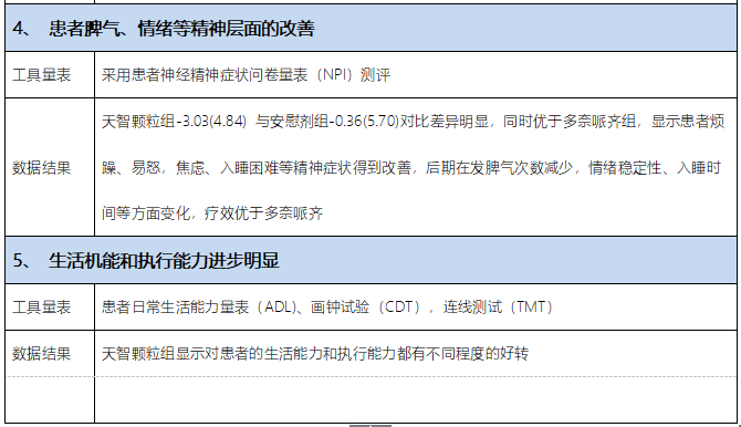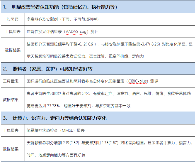 按试验设计,服药半年后对每个患者的安全性指标及认知功能、综合印象、综合认知、生活机能、执行功能、精神症状做全面评价,结果显示除了安全性良好外,治疗血管性痴呆药物天智颗粒在五个方面效果显著: