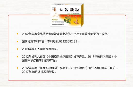 由于天智颗粒被多家国家级医学研究中心和一线医生在临床研究与应用中拓展,逐步被用于痴呆危险因素(高血压、高血脂),改善卒中引起焦虑、头痛头晕、失眠等症状的干预治疗,用于血管性痴呆、老年性痴呆的早期预防。故2017最新版《中国痴呆临床诊疗指南》对该品由首版的二级证据升为最新版的一级证据推荐用药。