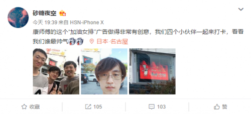 来自江苏镇江帅小伙儿倪远致是古屋大学的留学生,虽然学校离海报位置比较远,但他还是和三个同学坐车40分钟来到海报上线的商场合影留念。他兴奋地说:“之前就听说了加油女排的海报,将一路伴随中国女排征战到最后的横滨。在日本能看到中国企业做的这个广这样的海报,感觉特别亲切,激励,也特别自豪,也期待更多球迷一起到赛场给女排姑娘们助威。”