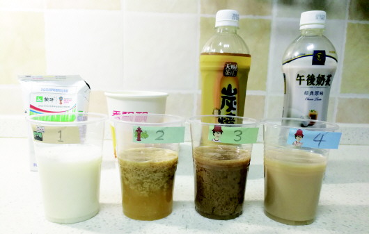 将4个杯子静置10分钟,让其充分反应后再度观察,杯内液体的絮状物情况较最初时又有了变化。其中,1号杯内的絮状物比较均匀、颗粒较细,看起来像稀果冻;2号杯内液体上下分层明显,絮状物在上层悬浮,絮状物的情况较1号明显;3号杯内的絮状物在4个杯子中最为明显,呈现出满杯的状态;4号杯内絮状物反应最为轻微,奶茶的液体前后变化不大,只产生了少量絮状物。