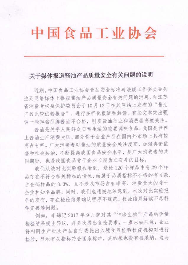 10月18日,中国食品工业协会发布声明,就近期江苏消保委公布酱油对比试验结果后,引发媒体报道酱油产品质量安全的情况发布声明。这也是继前一日中国调味品协会发布官方声明支持相关企业后,又一家协会公开发声。