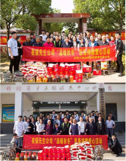 近期,由第5个国家扶贫日宣起的掀起热潮,安徽万盈品牌运营管理有限公司旗下夜猫先生公司当仁不让。由该公司董事长解光辉先生及副董事长周霞女士带领公司十多名职员到解光辉家乡柿树岗乡开展慈善捐赠活动,为柿树岗乡丁岗村贫困户和柿树岗乡五保供养中心的40户人家送去了每人一袋大米,一桶粮油,一箱豆奶饮品,和特地为每户老人准备的不锈钢小凳一个,暖心之举,甚是感动。在活动结束后,负责人解光辉表示此后公司将继续组织这样的活动,为柿树社会扶贫事业贡献一份力量。
