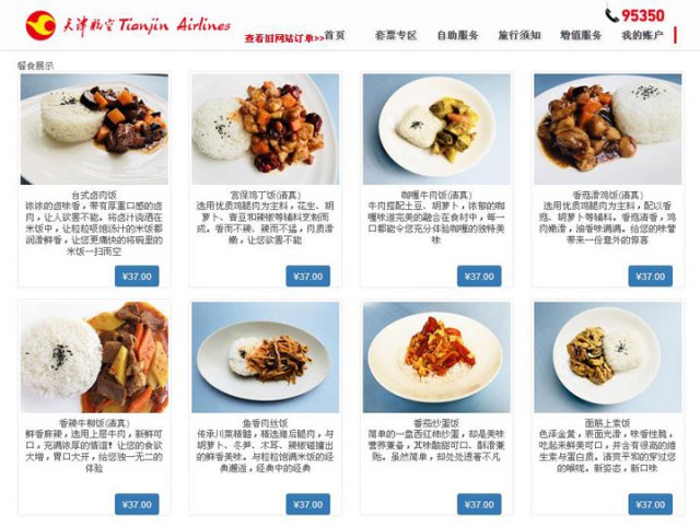 在天津航空官网展示的餐食中,现代快报记者注意到,盖浇饭都是每份37元,包括台式卤肉饭、宫保鸡丁饭、咖喱牛肉饭、香菇滑鸡饭、番茄炒蛋饭、鱼香肉丝饭等 8 种;还有 99 元一份的套餐,根据不同口味分为川味、齐鲁和粤味等 4 种,每份包括三碟小菜和一份米饭,比如“齐鲁经典”套餐包括红烧牛肉、酱爆鸡丁、素烧茄子和精致米饭。