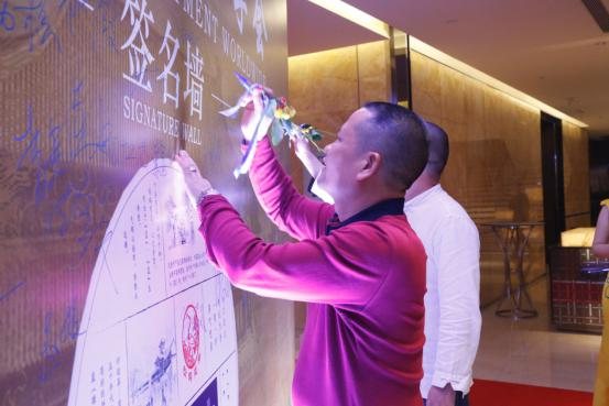 广东省书法家协会会员、广州市海珠区政协书画室特聘书法家李显达先生现场题字。“下关沱茶 印级传奇”八个大字,铿锵有力,行云流水,落笔如云烟,下关沱茶集团营销总监李小波先生上台接受赠送书法。