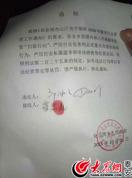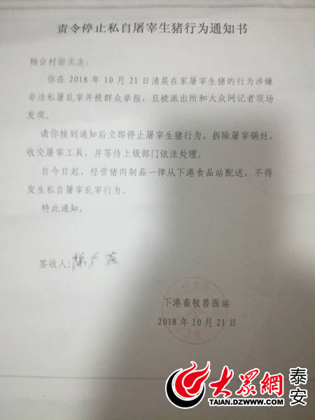 泰山景区下港镇向屠宰户下达《责令停止私自屠宰生猪行为通知书》