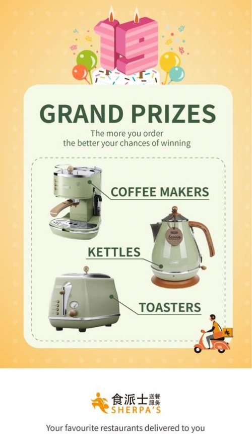 在喜迎19周年之际,食派士于 2018.10.19-11.6 推出一系列诚意满满的美食促销活动,19个红包免费领(限北京和上海地区),苏州和杭州的小伙伴有机会获得价值 385 元和 380 元的红包组合。在食派士下单随机送19周年精美马克杯, 还有意大利进口咖啡机、面包机、热水壶等你来拿,下单越多,中奖概率越高!