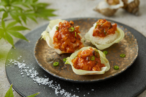 螺肉的脂肪较低,口感有韧性,也可根据个人喜好替换成鸡肉或者猪肉。在新鲜的生菜叶上放上烹调后香甜的肉,再加上少许包饭酱,辣椒或大蒜等佐料后包起来。记得要整个放入嘴中,那么香喷喷的肉就会和甜爽的生菜融为一体。清净园包饭酱中加入了洋葱、蒜、芝麻等多种配料,口感丰富醇香,咸度适宜,可以根据自己的口味,调整包的肉和蔬菜,变化更多样。