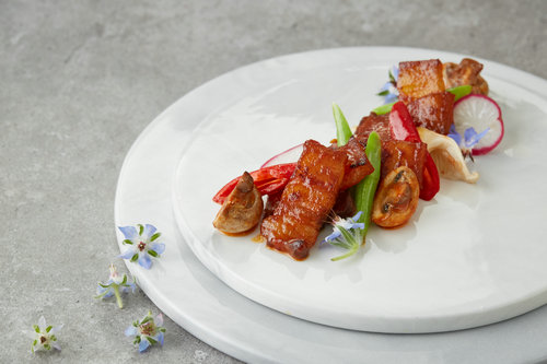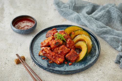 经常作为下酒菜和晚餐食用的五花肉经清净园辣椒酱腌渍后甜辣可口,加入糖稀和红酒,中和了辣椒酱的辣味,口感也更鲜爽丰富。酱汁包裹在肉的表面,烤好后的颜色红亮诱人非常漂亮。