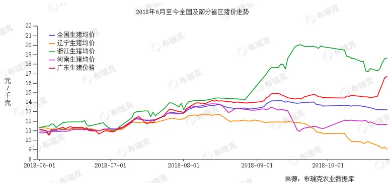 随着疫情的出现,浙江为主的销区价格上涨,一度达到21元/公斤,同期辽宁跌至11元/公斤。具体来说,作为主产区,同时又是疫情发现的辽宁,10月中旬,猪价跌破了10元/公斤,甚至出现8.5元/公斤的行情。广东作为生猪缺口省份,猪价整体偏强。由于近期疫情又在湖南、贵州、云南等地发现,广东地区猪价快速飙升,至10月27日,突破18元/公斤。