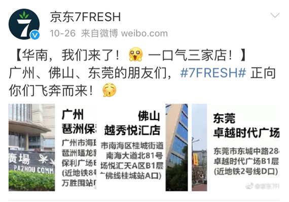 近日,有眼尖的网友发现京东7FRESH官方发布了“华南店面正式官宣,不止一家哦”的正式对外信息,这也标志着京东7FRESH正式进击华南市场。据了解,此次进驻华南“广佛莞”3座城市是京东7FRESH继9月19日签约16家地产商开启全国战略扩张后的又一重大推进。自此,京东7FRESH已官方宣布先后在华北、华南两个地区落地门店,,进一步落实着“3-5年内在全国范围开设1000家门店”的目标计划。