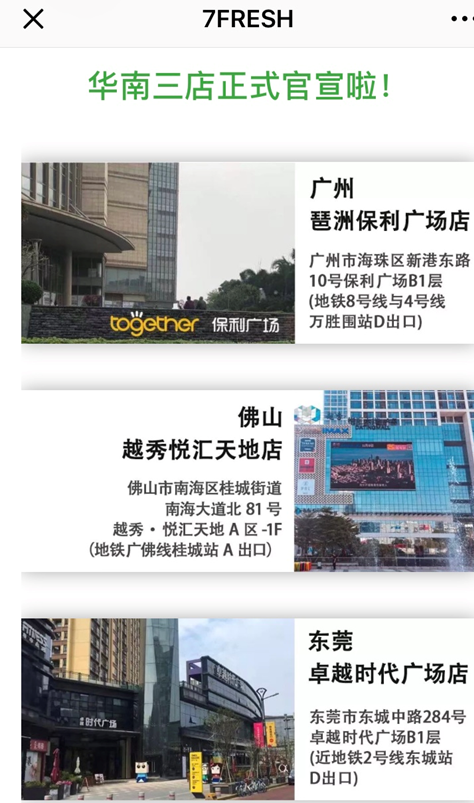 7FRESH广州“琶洲保利广场店”地址:广州市海珠区新港东路10号保利广场B1层;