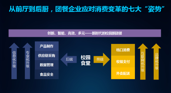对于团餐企业来说,应对消费变革,满足各方需求,需要对前后端各个环节进行优化。在前端,促进档口消费的品牌化升级、收银支付方面的互联网化升级,并增加营销互动、外卖配送的服务;在后端,促进产品制作的智能化升级、供应链采购和食品安全的专业化升级、数据管理的信息化升级,从而推动传统团餐向更加创新、智能、高效、多元的新团餐迈进。