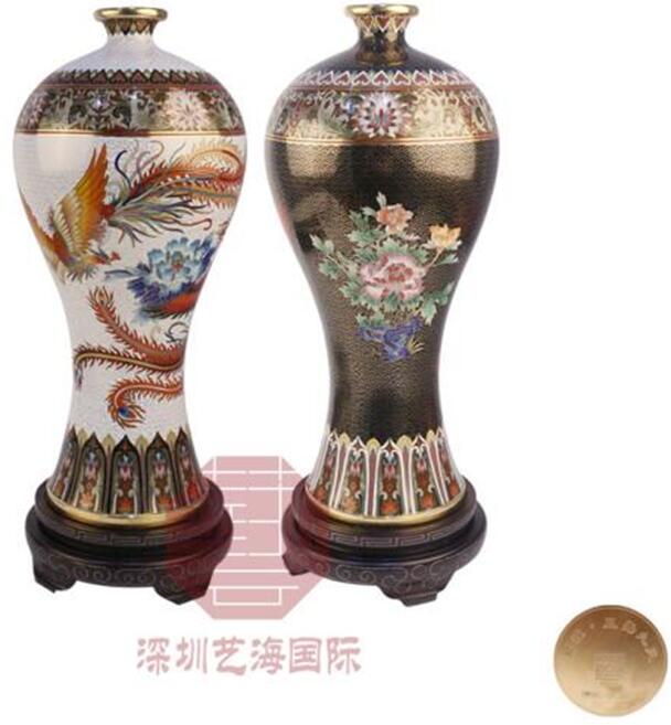 此件藏品是一带一路凤舞九天张同禄大师封官之作品,(凤舞九天)造型源自瓷器中的经典器型梅瓶,张同禄大师将梅瓶器形肩部略修,腹部曲收,更显婉转清秀,优美动人。作品以象征服福瑞的百鸟之王凤凰和象征富贵的百花之王牡丹为主题,双凤凰环绕雍容华美的牡丹华,翩翩起舞,相互追逐,一派喜庆景象,还有双凤吉祥,花开富贵之寓意,凤凰长尾随风而摆,飘洒如瀑,其色彩之绚丽,如虹胜霞,其双翼之凤羽层层叠叠云排而上,一曲一放张合有度,其曲者蓄势万钧,放者挥洒如云,有乘风而上之势。整体瓶型更是婉转清秀,优美动人,如月夜之下,翩然起舞的绝代佳人。作品造型与图案相得益彰,凤凰似与瓶合为一体,表现了大师对美的极致追求,超凡脱俗,气质卓然,具有极高的艺术价值和收藏价值。