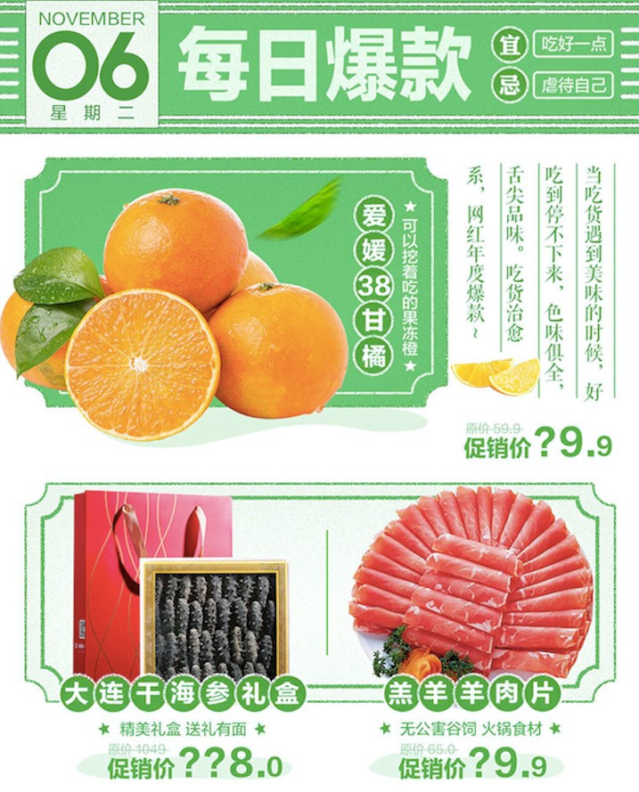 为了让消费者能够享受到应季的新鲜美食,京东生鲜打造超强剁手指南“京东生鲜爆品日历”,将全球精选好货以日历的方式呈现,跟着日历走,低价好物全都有!快来看看11.6有哪些小惊喜吧:正值成熟柑橘上市,我们准备了果肉饱满、甜度超高的四川眉山爱媛38号柑橘;秋冬进补正当时,新鲜滋养、肉质Q弹的参天朝大连野生淡干海参来帮你;还有火锅季必不可少的草原宏宝羔羊肉片,肉质鲜嫩细腻、入口难忘。这等网红爆品,千万别错过。