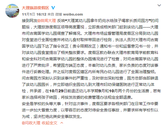 通报称,接到网友反映的问题后,大理省级旅游度假区管理委员会领导高度重视,立即责成相关部门赶到幼儿园调查。