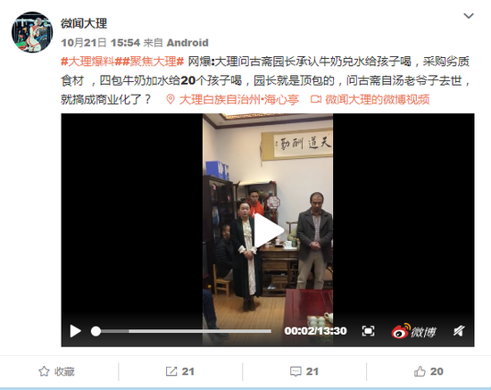 近日,新浪网友“微闻大理”反映称,云南大理问古斋国学幼儿园拿兑水的牛奶给孩子喝,饭菜使用劣质食材,还克扣孩子的伙食。为此,云南大理省级旅游度假区管理委员会官方微博“大理旅游度假区”发布调查情况通报称,园方总部已辞退了该幼儿园园长,并立即组织全园幼儿到大理市妇幼保健医院进行体检。